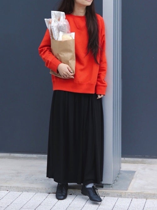 スウェットとスカートでシンプルに仕上がった着こなしですが、鮮烈なオレンジスウェットでフレンチカジュアルにチェンジ。