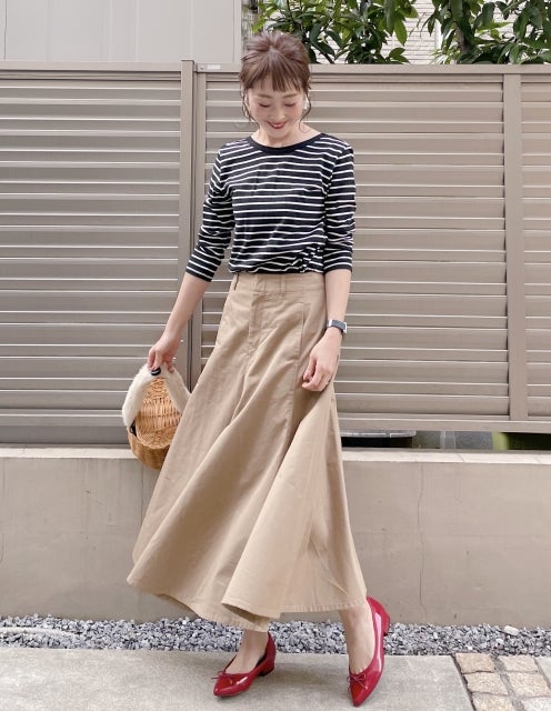 私はブラックのボーダーを合わせましたが、どんな色のボーダートップスでも合います。