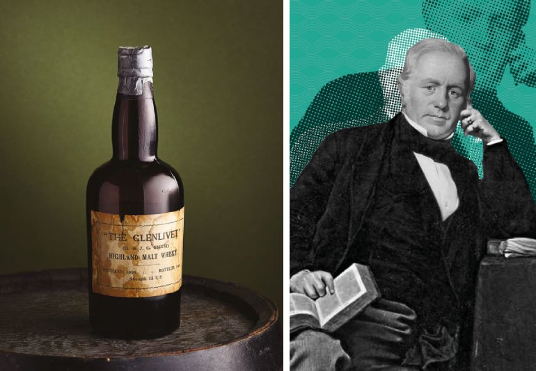 ▲(左)現存している最古の「ザ・グレンリベット」。(右)創業者ジョージ・スミス。