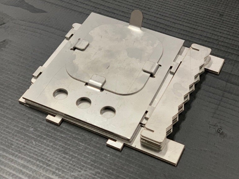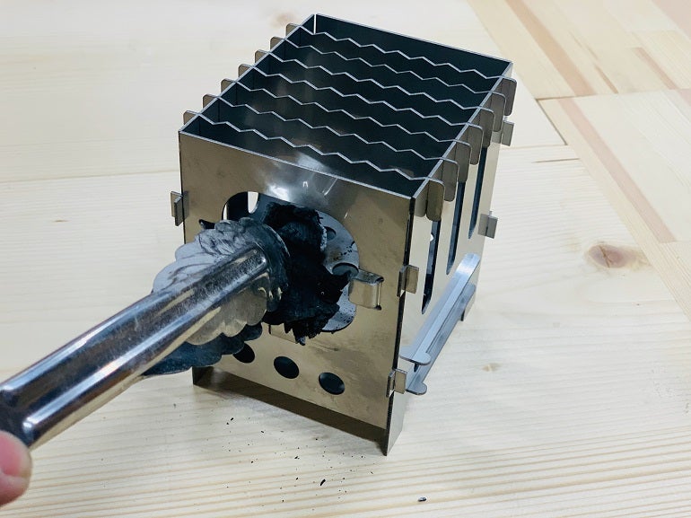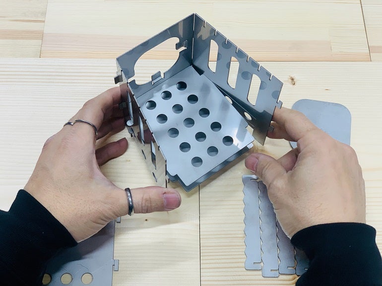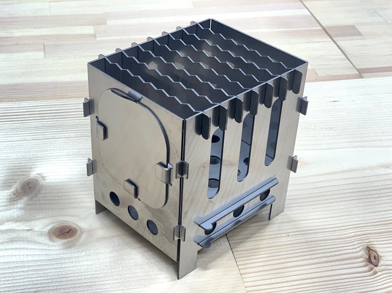 厚さ1.2mmの14枚のステンレス板を模型のように組み立てるだけで完成。背面から炭をくべることができるほか、底面は二重構造となっており、火のまわりをよくするため底面上側には穴が空いている。