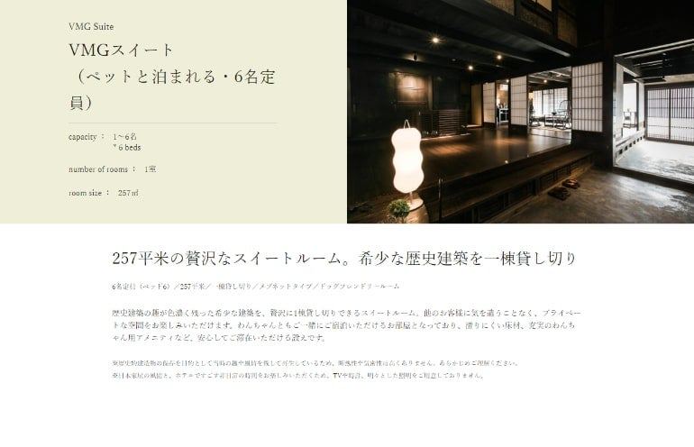 古民家を可能な限りそのままにリノベートした客室はどこか昔懐かしい雰囲気。愛犬とともに、そんなくつろげる空間で過ごしたり、情緒ある町並みを散策したりする休日は、何ものにも代えがたい時間になってくれるだろう。