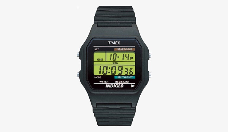 タイメックスの「クラシックデジタル」。シルバーとゴールドは世界展開されているが、写真の黒は日本限定。最もベーシックなモデルで、服装を選ばず活用できる。