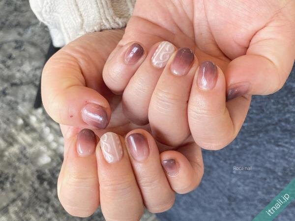 ニットネイルは冬季限定の大人かわいいデザイン。厚手のコートを脱ぐ季節がくる前に、冬のオシャレをたっぷり楽しんでおきましょう。ブラウンのグラデーションネイルは根元がクリアだから重たくなりすぎず、春はもうすぐそこというシチュエーションでも違和感ゼロです。