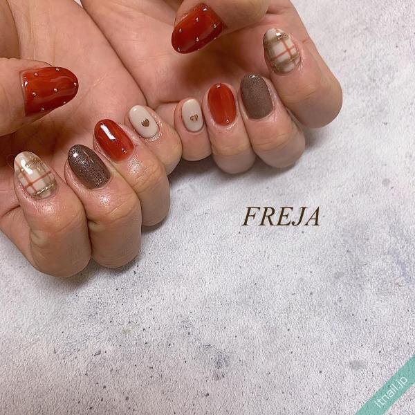 レッドとブラウン、オフホワイトの組み合わせがかわいいチェックネイル。小粒のスタッズでつくるドット柄や、小指のハートもアクセントが効いています。今冬ラストのネイルデザインはガーリーにきめてみませんか?