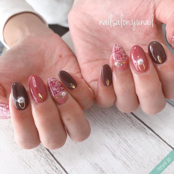 春を始める前のタイミングにピッタリな色合わせのツイードネイル。ピンクとブラウンのかけ合わせはあたたかみが感じられて、指先をハッピーな雰囲気で包み込んでくれます。ゴールドパーツや大粒のパールでエレガントに飾って。