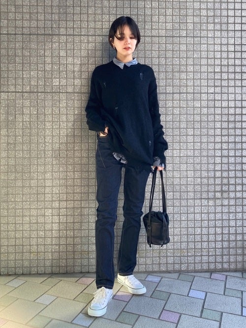 黒ニット×ネイビーデニムパンツの30代向けコーデ