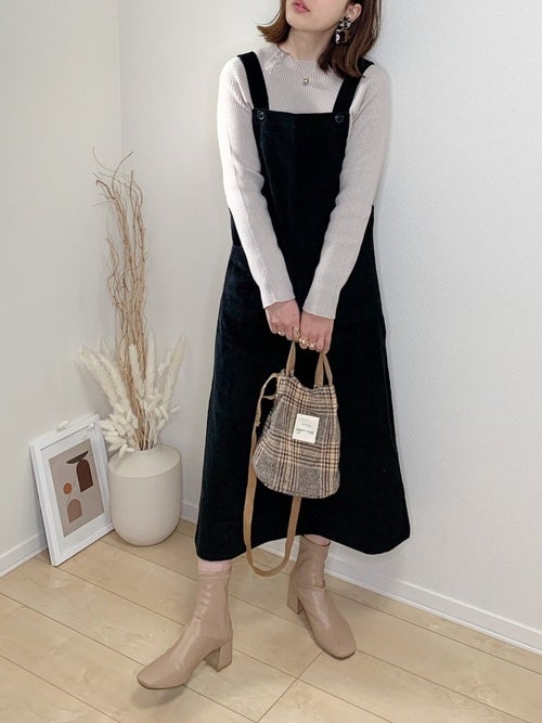 フェミニンなレディースコーディネートがお好みなら、可愛いけれど甘くなり過ぎない、ベージュトップス+黒コーデュロイワンピースのきれいめカジュアルファッションにチャレンジしてみてはいかが?