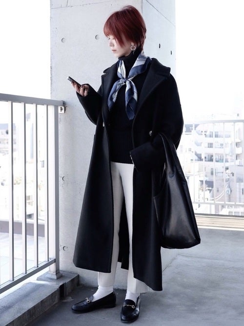 黒ロングアウター×白パンツの30代向けコーデ