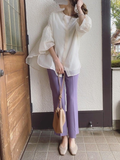 白シアーブラウス×紫パンツの30代向けコーデ