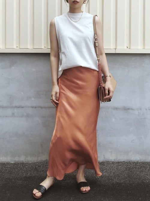 スニーカーやデニム中心のボーイッシュなスタイルではラフ過ぎると感じたら、ベージュのプレーンなタンクトップに、オレンジのサテンロングスカートを合わせた、フェミニンなカジュアルスタイルがおすすめですよ。