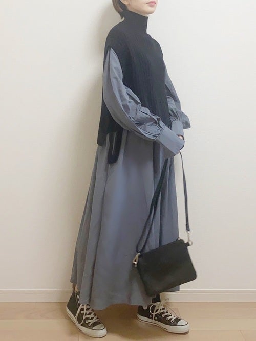 黒ニットベスト×グレーワンピの30代向けコーデ