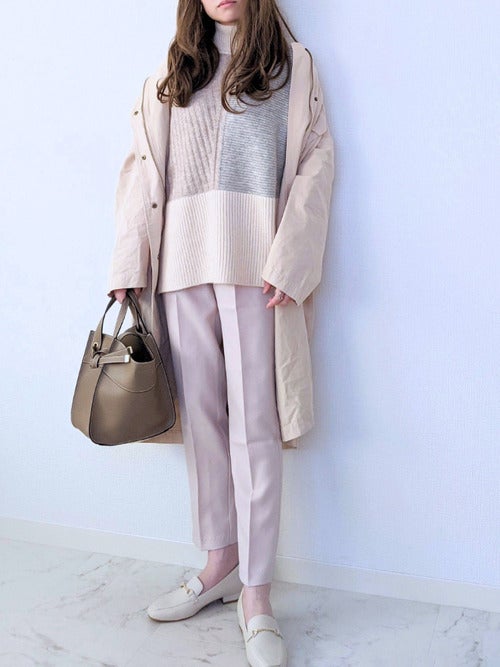柔らかなニュアンスカラーを幾重にも重ねることで、大人女性らしい奥行きのあるきれいめカジュアルファッションに仕上がりますよ。