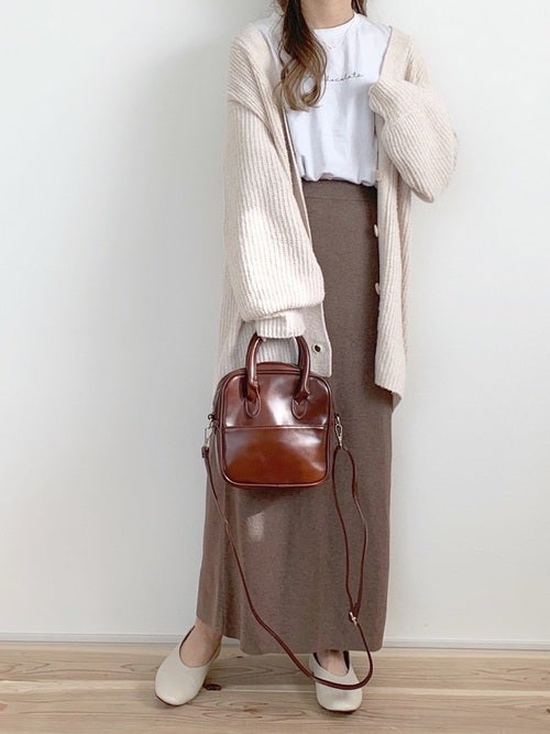 30代の春のきれいめカジュアルなコーディネートはオフホワイトのロングカーディガン&ブラウンタイトスカートの絶妙なバランスがおしゃれな着こなしからスタートさせてみてはいかがでしょうか。