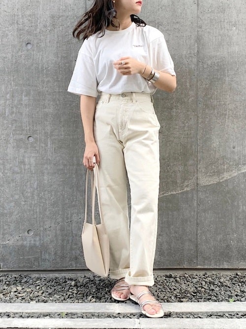 白ロゴTシャツ×白デニムパンツの30代向けコーデ