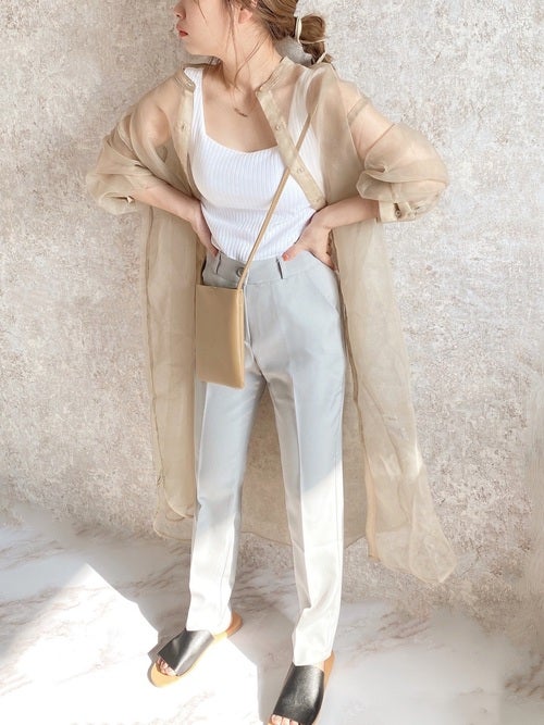 暑い真夏にぴったりな白タンクトップ+テーパードパンツのきれいめコーディネートですが、30代ともなると二の腕など気になる部分をさりげなくカバーしたい人も多いですよね。