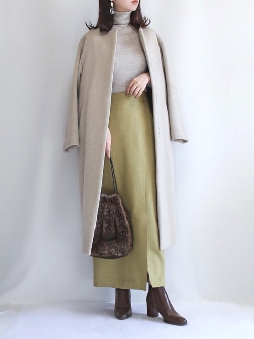 特に2021年冬の一推しは、ベージュやブラウンのアイテムとも合わせやすいライムグリーンのロングタイトスカート。