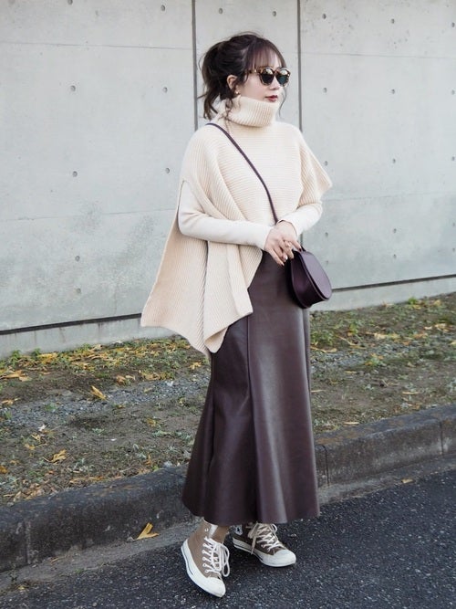 ボトムスは広がって見えるアイテムより、画像のようなレザー素材のレディースマーメイドスカートなど、すっきりしたシルエットのお洋服を選ぶのが2021年流のきれいめカジュアルコーディネートですよ。