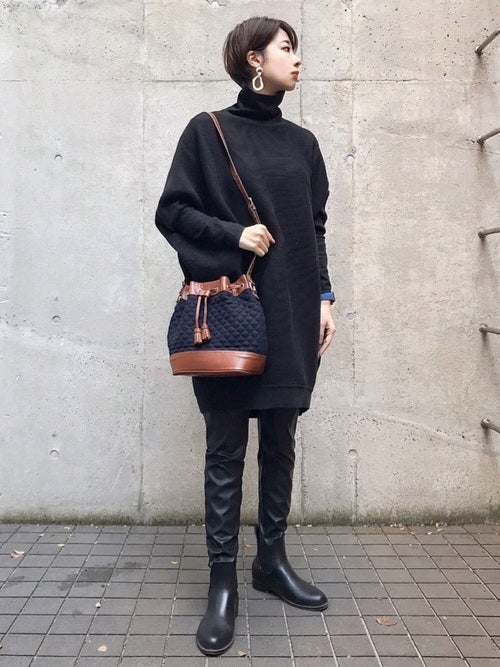 黒ニットワンピ×レザーレギンスの30代向けコーデ