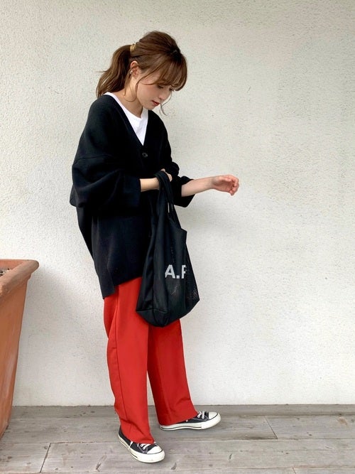 黒カーディガン×赤パンツの30代向けコーデ