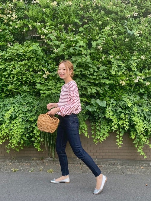 赤ボーダートップス×紺デニムの30代向けコーデ