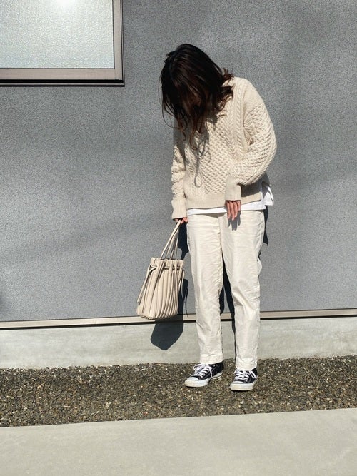 ざっくり編みが可愛いしまむらのニット。ワントーンでまとめたコーディネートは女性らしいソフトな印象で春にも合っていますね。