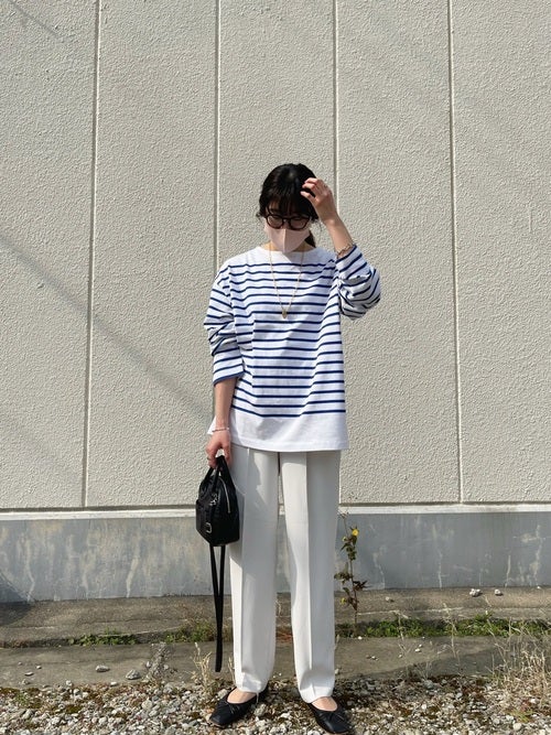 春に使いたいブルー簿のボーダートップスも、きれいめに着こなせていますね。