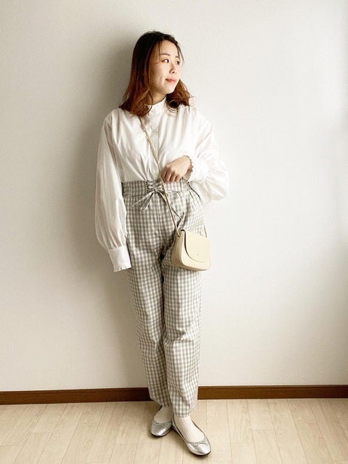 ワントーンコーデはトレンドになっていますが、着こなし方によっては地味見えしてしまいがちなので、チェックパンツで存在感を上げましょう。