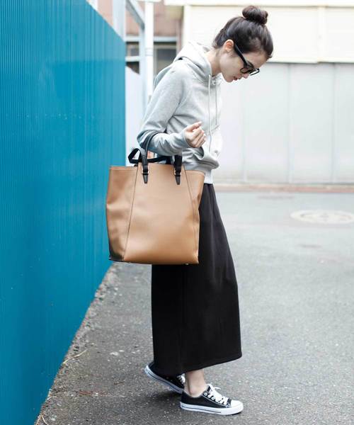ジャストサイズのグレーのプルパーカーと合わせてきれいめに着こなして。旬のスクエアバッグがトレンド感をプラスしてくれますね。