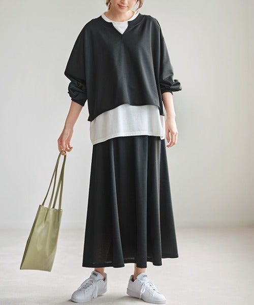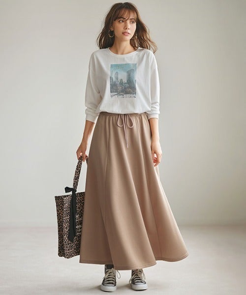 自然に広がるフレアデザインのスウェットロングスカート。キーネックになった首元とゆるっとしたシルエットがおしゃれなトップスに白Tを合わせて。