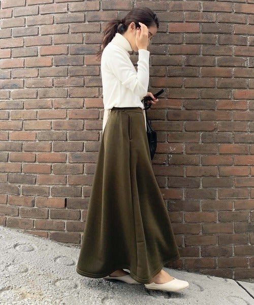 カーキのマキシスウェットスカートは大人カジュアルに使いやすいおすすめアイテム。きれいに広がるシルエットが体型もきちんとカバーしてくれます。