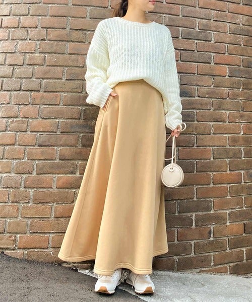 明るいベージュのスウェットマキシスカートは柔らかさのあるしっかりとした生地とふわっとしたシルエットが女性らしいアイテム。