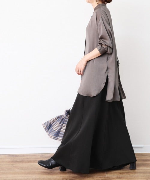 サテン素材のロングシャツでさらっとコーディネートして。