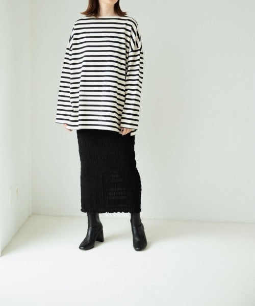 凹凸感のあるシャーリングが特徴のタイトスカート。さりげない洒落感をプラスしてくれる一枚です。