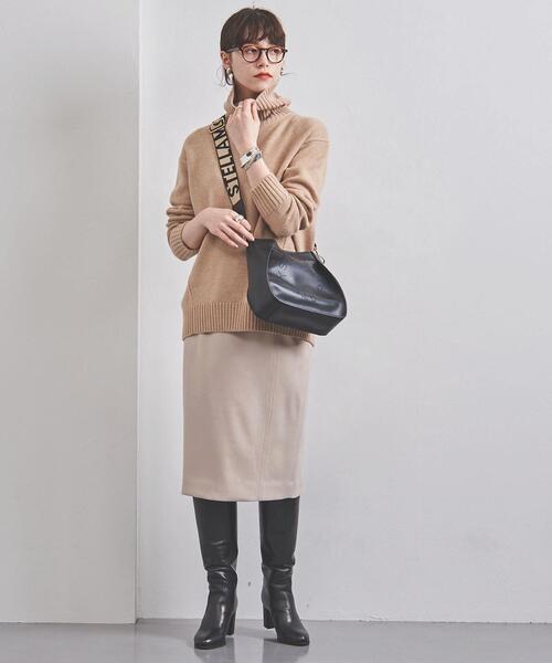 上品なミモレ丈のタイトスカートは、柔らかな印象のナチュラルカラーをチョイス。