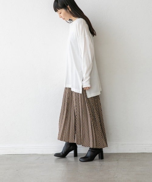シンプルなコーデのアクセントとしておすすめな幾何学模様のプリーツスカート。