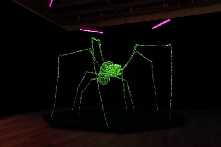 ▲大蜘蛛伝説 2018 ウランガラス、アルミワイヤー、ブラックライト H355×W380×D233cm 撮影:Kei Miyajima ©Ken + Julia Yonetani Courtesy of the Artists and Mizuma Art