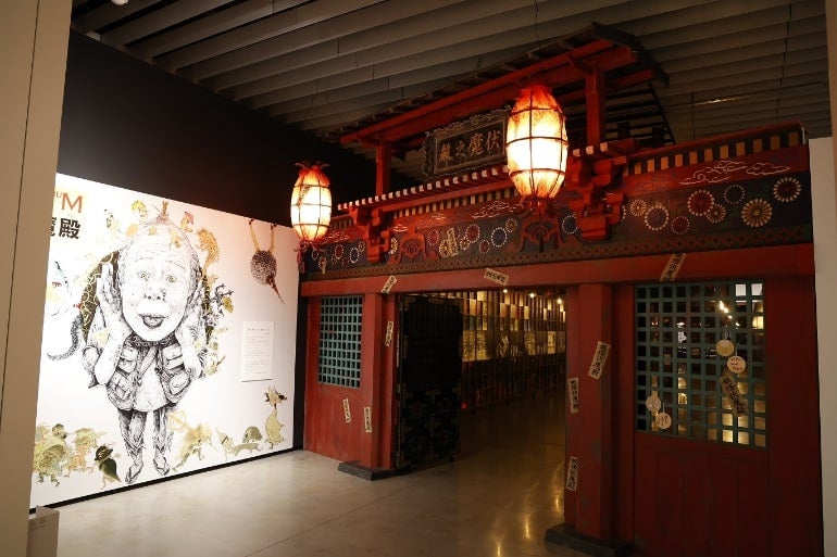 日本各地に潜む見える妖怪から誰も見たことがない妖怪まで、妖怪のありようを端的に表した荒俣語録とともに紹介している。さらに新進気鋭のイラストレーターが描く妖怪絵図や、妖怪のイメージが具象化されたミイラなど、伏魔之殿門の向こうに広がる異世界空間を楽しむことができる。