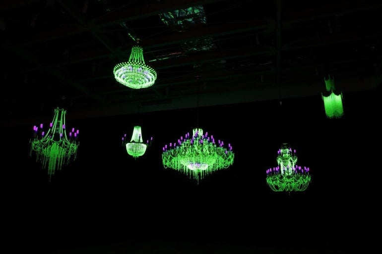▲クリスタルパレス: 万原子力発電国産業製作品大博覧会 2012~ ウランガラス、シャンデリアフレーム、ブラックライト 撮影:Kei Miyajima ©Ken + Julia Yonetani Courtesy of the Artists and Mi