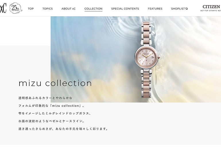 シチズン「クロスシー」より登場した「mizu collection」は、透明感と水をイメージさせるデザイン。シチズン独自のエコ・ドライブを搭載し、日中米欧電波を受信することができるため、海外旅行に便利。