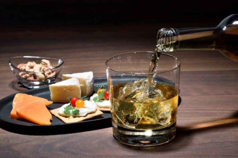 続いては「ロックで楽しむ」。大きめの氷を浮かべて、軽やかな口当たりを楽しもう。チーズやナッツとの相性が抜群だ。