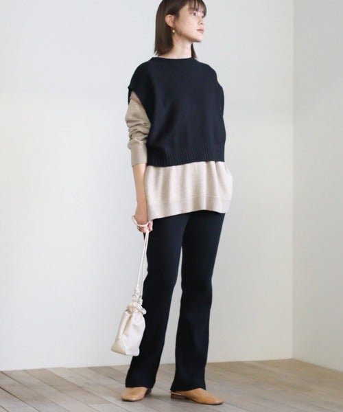 シンプルにモノトーンカラーでまとめたコーディネート。でも、ニットベストを使うことでトレンディな着こなしに仕上げています。