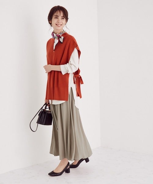 スカートコーデにもニットベストを合わせてトレンド感を出したいですね。さらに首元にスカーフを巻くと、大人の上品さあるトレンドコーデに仕上がります。