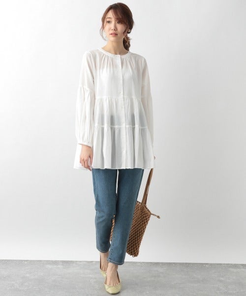 デニムパンツでカジュアルダウンすることで、甘めなブラウスも大人女性が着こなしやすくなりますね。