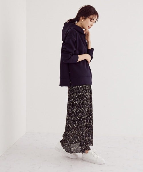 モノトーン配色のフラワープリントスカートはシックで大人っぽい。だから、靴をスニーカーにしても大人の上品さがそのままできれいめに見えるんです。