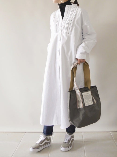 清潔感のある白シャツワンピースでシンプルながらも、おしゃれに見える大人のレディースファッションを。