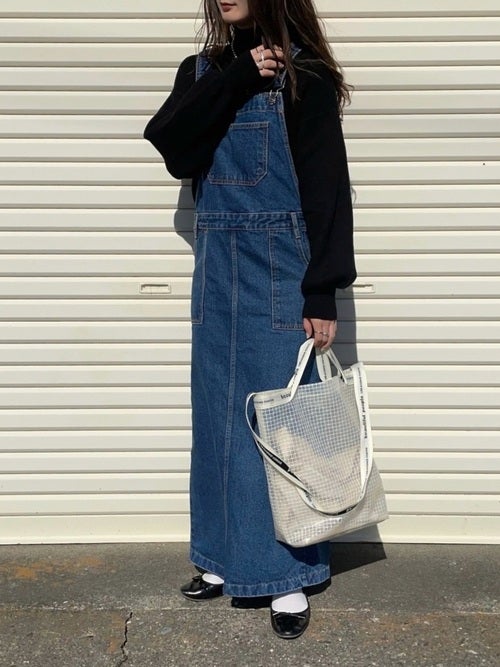 今年人気のデニムサロペットスカートも大人っぽくクールに見せてくれるGUの黒ニット。