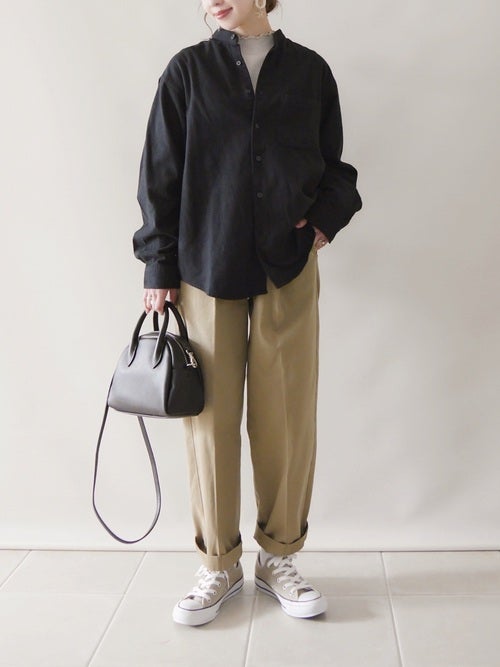 バンドカラーのオーバーサイズシャツは、清潔感のある着こなしを後押ししてくれます。
