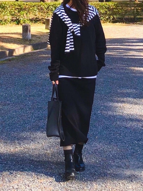 肩掛けしたボーダートップスがアクセントになっています。