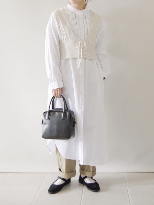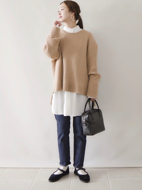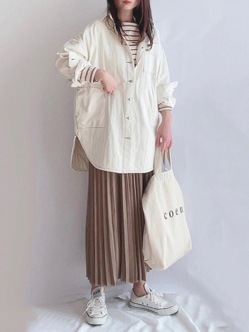 一枚で着るのはもちろん、ニットとレイヤードするのもおすすめ。ボトムはコンパクトにまとめてすっきり仕上げましょう。