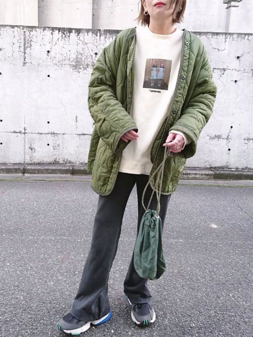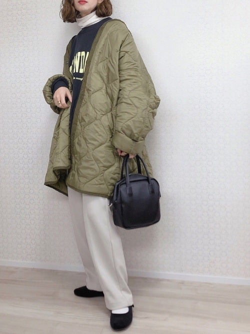 キルティングジャケットは、少し襟を抜いて着ると垢抜けた雰囲気に。